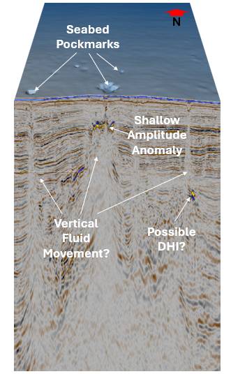 As shown, certain seabed features such as shallow depressions or pockmarks, some of which can extend to several hundred metres in diameter, can often be associated with hydrocarbons venting at the seafloor. These surface features may be linked to subsurface seismic features indicative of fluid migration, including vertical migration pathways (or fluid escape chimneys) and shallow amplitude anomalies which, in the image below, can be seen directly beneath the surface pockmarks, together with nearby seismic responses that may represent direct hydrocarbon indicators (DHIs) in the form of bright soft amplitude responses.