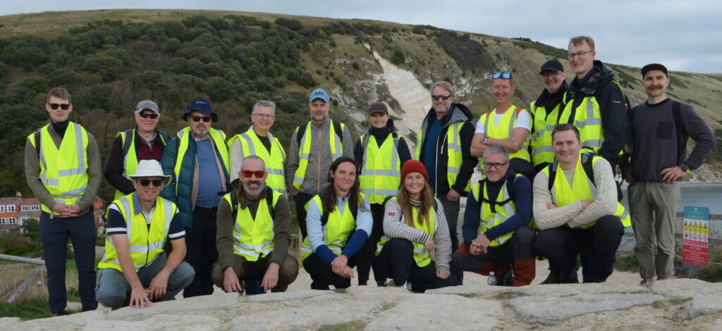Although the trip focused on the Dorset petroleum systems elements, so much is directly analogous to the global industry, such as structural trap geometries (and how to image them), fault damage zones, internal reservoir architecture, source rocks, migration pathways, sequence stratigraphy and so much more. The inversion structure at Lulworth Cove was directly compared to an AkerBP seismic example from the Norwegian North Sea and the group was able to discuss the details of what can and cannot be imaged on seismic data, together with the seismic resolution of reservoirs, at the outcrop. In addition, some of the North Sea’s key unconformities and sequence boundaries can be viewed in Dorset and their importance revealed.