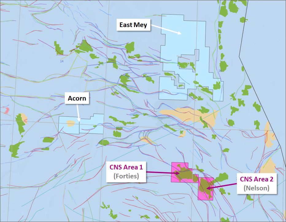 New CCS locations offered in the Northern North Sea. Pink areas are locations on offer in this round and blue areas are existing CCS licenses.